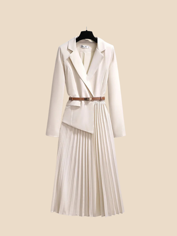Sukienka Alexis to idealne połączenie elegancji i komfortu. Jej strukturalny design z bluzą w stylu blazer oraz plisowaną spódnicą zapewnia doskonałe dopasowanie. Regulowany pasek podkreśla talię, co czyni ją uniwersalnym wyborem na formalne i codzienne wieczorne wyjścia.