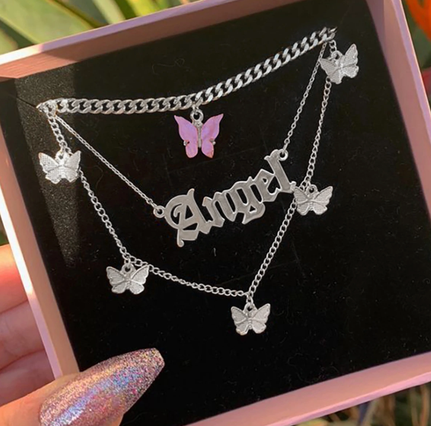 Podwójna warstwa z symbolicznymi charmsami: Anioł i motyle symbolizują ochronę i transformację.