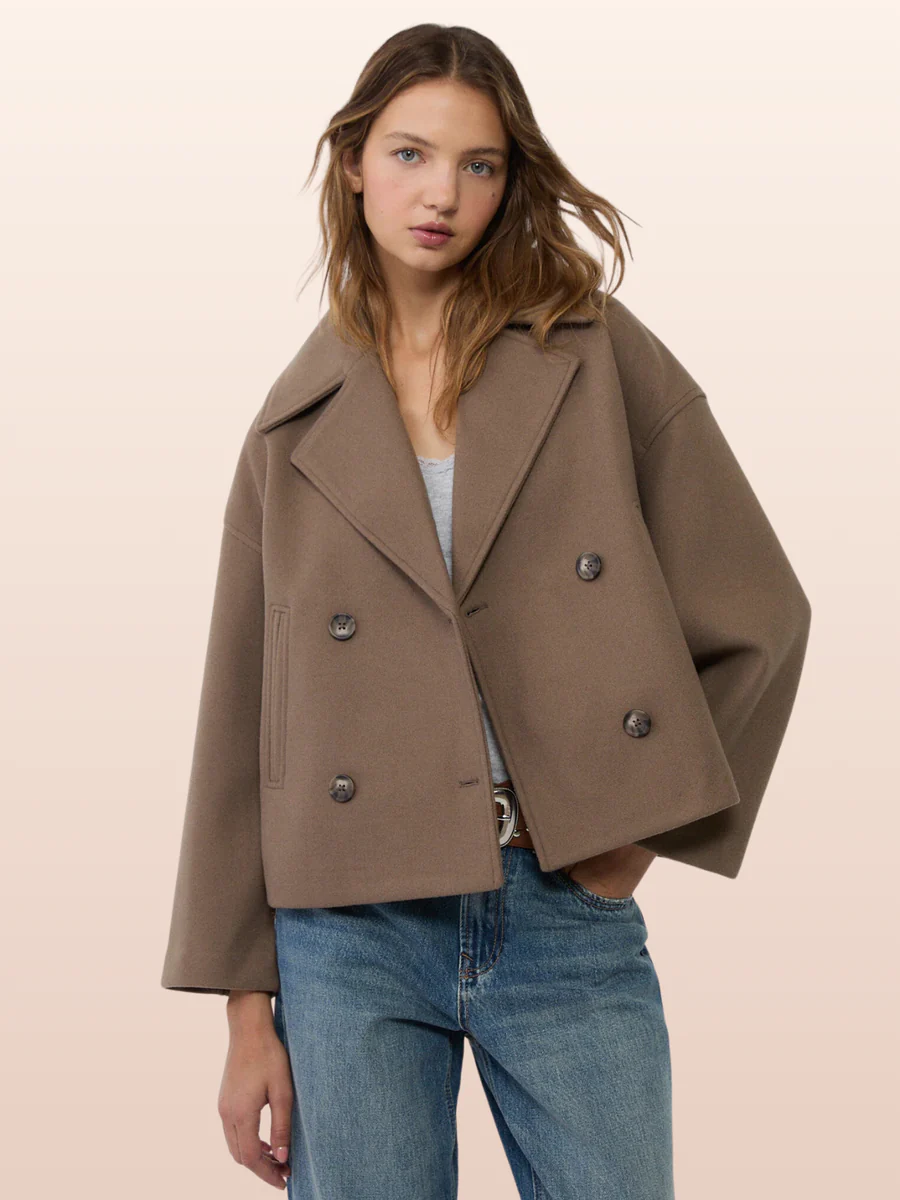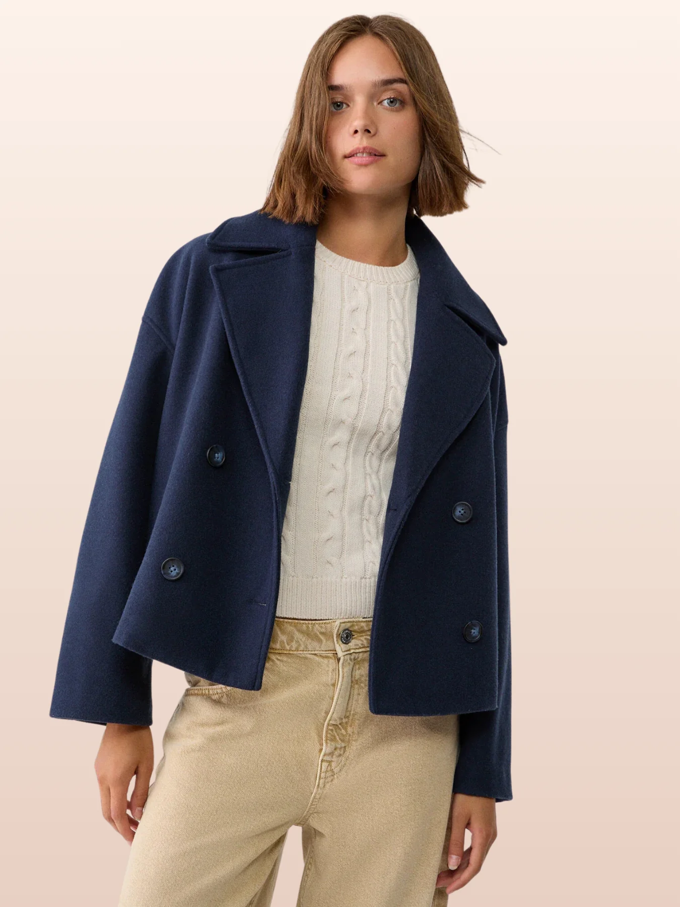 Ta krótka kurtka dwurzędowa emanuje ponadczasową elegancją, dodając szczyptę wyrafinowania do każdej stylizacji, nie będąc przy tym przesadną.