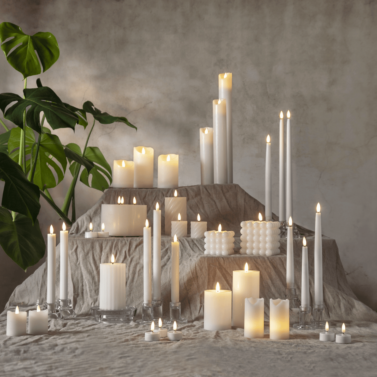 Stylowa elegancja: Klasyczna forma świecy filarowej wzbogacona o trzy realistyczne płomienie LED.